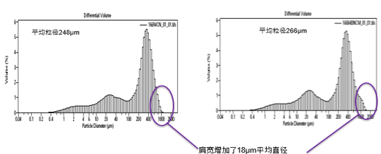 圖4:咖啡樣品,分布較寬,納米到1000+微米,2個(gè)批次僅在1000+微米處有一點(diǎn)變化導(dǎo)致平均粒徑變化18微米,高分辨技術(shù)仍然可以精準(zhǔn)地捕捉到,幫助QC很好實(shí)現(xiàn)質(zhì)控。