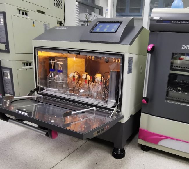 據(jù)陶教授介紹,實驗室目前主要做生物化學(xué)和代謝工程,在微生物菌種改造實驗時需用到大量的搖床,智城提供了兩款非常先進(jìn)的細(xì)胞培養(yǎng)設(shè)備。首先是ZWYF-290型細(xì)胞生長曲線(OD值)在線檢測搖床,它能夠同時容納16個菌株,是目前國內(nèi)首家,無需人為干預(yù),可連續(xù)自動取樣,在線檢測細(xì)胞生長曲線的搖床,既節(jié)省了人力,又保證了數(shù)據(jù)的準(zhǔn)確度,耗材成本很低。傳統(tǒng)檢測微生物生長曲線時,每隔半小時就要取樣檢測,非常繁瑣,也容易干擾實驗進(jìn)程,智城捐贈的這款儀器是理想的解決方案。