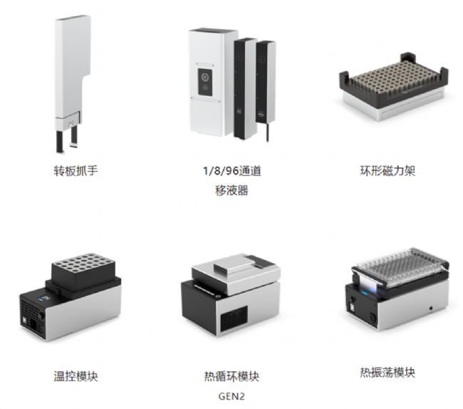 Opentrons Flex 還包含一系列配件和模塊,包括轉板抓手、1/8/96 通道移液器、環(huán)形磁力架、溫控模塊、熱循環(huán)模塊 GEN2、熱振蕩模塊和 HEPA/UV 模塊等,這些配件和模組與 Flex 系列工作站完美融合,共同構建成完整的自動化實驗平臺。