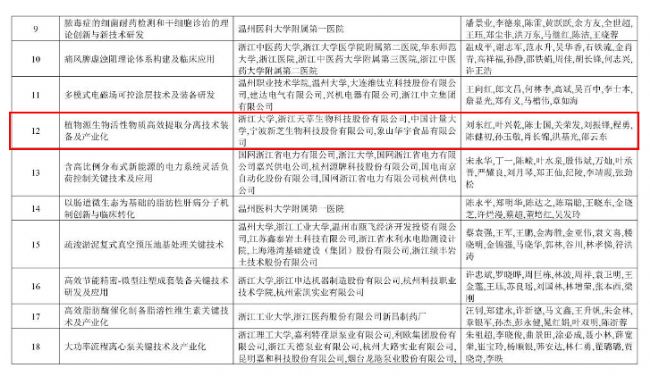 其中由浙江大學、中國計量大學和寧波新芝生物科技股份有限公司等單位合作的“植物源生物活性物質(zhì)高效提取分離技術(shù)裝備及產(chǎn)業(yè)化”項目榮獲浙江省科技進步一等獎。