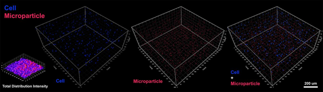 共聚焦圖像的3D建模顯示水凝膠結(jié)構(gòu)內(nèi)細胞(藍色)和TMP(紅色)的均勻3D分布,表明水凝膠結(jié)構(gòu)中細胞和磁性顆粒的均勻分布。