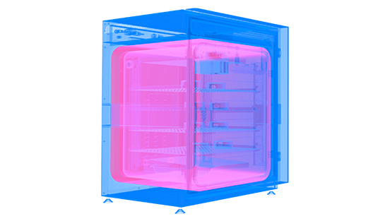 三維立體循環(huán)風(fēng)道,強(qiáng)制對(duì)流,腔體內(nèi)溫度均一性≤±0.3℃ @37℃,CO2濃度和濕度均一性好