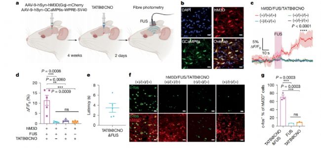 該研究提出使用多孔氫鍵有機框架(HOFs)作為FUS工具包的概念。作者開發(fā)超聲化學遺傳學技術,用納米材料裝載設計藥物CNO,在小鼠和大鼠的腹側被蓋區(qū)(VTA)進行實驗。通過光纖記錄等技術檢測神經(jīng)元活動和行為變化,結果表明該技術能實現(xiàn)深部腦區(qū)神經(jīng)元的快速激活,有效調節(jié)小鼠和大鼠的獎勵學習行為和抑郁相關行為,且生物相容性良好,實現(xiàn)超聲觸發(fā)的藥物激活和無創(chuàng)神經(jīng)控制。該納米材料可無創(chuàng)調控深部腦組織激活及藥物釋放,為無創(chuàng)、時空精準的分子治療提供新方案。