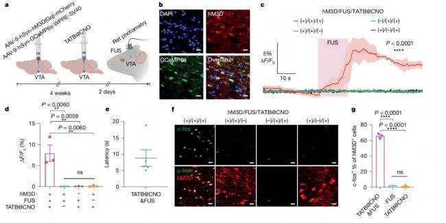 瑞沃德光纖記錄系統(tǒng)幫助研究者在大/小鼠VTA腦區(qū)監(jiān)測超聲刺激下引起的神經(jīng)元鈣信號變化,反映神經(jīng)元活動,從而證明超聲化學遺傳學技術能實現(xiàn)深部腦區(qū)神經(jīng)元的快速激活和藥物釋放。