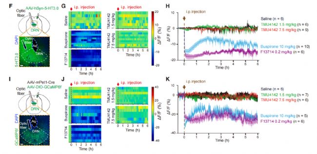 本研究使用瑞沃德光纖記錄和5-HT3.0、GCaMP6f探針工具,監(jiān)測抑郁小鼠DRN區(qū)5-HT濃度與神經(jīng)元鈣信號,證實TMU4142無負反饋副作用、作用特異,并關聯(lián)神經(jīng)信號與行為改善,為其機制提供關鍵在體證據(jù)。