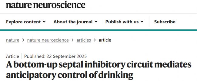 該研究揭示了內側隔核(MS)到穹窿下器官(SFO)的GABA能抑制性通路在預測性飲水調控中的關鍵作用。研究發(fā)現(xiàn),MS的GABA能神經(jīng)元整合口腔和胃腸道信號,編碼水飽足感,經(jīng)臂旁核(PBN)輸入后投射至SFO的CaMKII神經(jīng)元,從而在血液滲透壓改變之前精細控制飲水起始與終止,該通路功能異常會導致飲水過量和低鈉血癥,說明該回路在飲水終止與體液穩(wěn)態(tài)中具有關鍵作用。