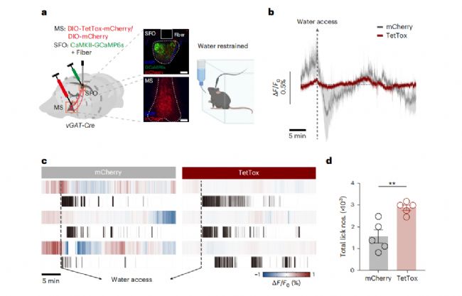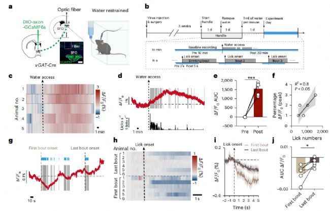 研究團隊利用瑞沃德光纖記錄系統(tǒng),在自由活動小鼠中實時監(jiān)測MSvGAT–SFO通路的鈣信號動態(tài),捕捉飲水時的瞬時抑制與飲水后的逐步激活;驗證神經(jīng)元活動與舔舐次數(shù)、飲水狀態(tài)的相關性,為理解飲水行為的預測性調控機制提供了關鍵在體證據(jù)。