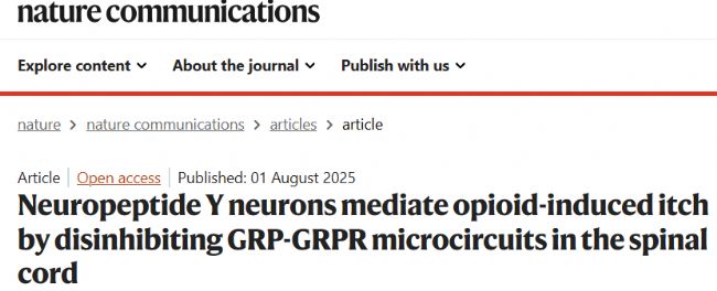 該研究發(fā)現(xiàn)脊髓背角(SDH)神經(jīng)肽Y陽性(NPY⁺)抑制性中間神經(jīng)元上的 μ-阿片受體(MOR)是阿片類藥物誘導瘙癢的關鍵介質。嗎啡等阿片類藥物通過激活MOR抑制NPY⁺神經(jīng)元興奮性,解除其對胃泌素釋放肽陽性(GRP⁺)神經(jīng)元的抑制作用,進而激活胃泌素釋放肽受體(GRPR)陽性神經(jīng)元引發(fā)瘙癢,NPY-NPY1R 系統(tǒng)可調控該環(huán)路。