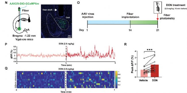 瑞沃德光纖記錄系統(tǒng)實時監(jiān)測了CeAᴳᴬᴮᴬ神經(jīng)元的鈣信號變化,證實DON可顯著升高其神經(jīng)元活性,為PVT-CeA環(huán)路調控DON毒性相關行為的機制提供了直接在體證據(jù)。