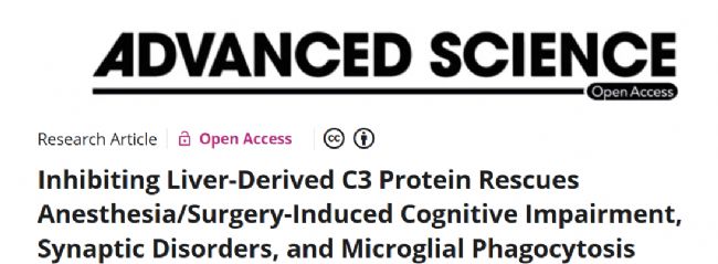 該研究發(fā)現(xiàn)麻醉/手術可通過誘導肝臟C3基因啟動子區(qū)低甲基化,促進肝臟分泌C3蛋白,同時破壞血腦屏障(BBB),使外周C3進入海馬體并與C3aR結合,激活小膠質細胞吞噬突觸,導致突觸結構功能損傷及認知障礙。抑制肝臟來源C3可逆轉上述病理變化與認知缺陷,且手術患者圍術期血清C3水平變化與術后認知功能障礙(POCD)相關,可作為POCD預測生物標志物。