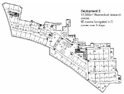 如此大型的項目需要大量的前期準備工作,在實施的每個階段Bioquell的RBDS項目經(jīng)理同客戶保持著緊密的聯(lián)絡(luò)。根據(jù)目標區(qū)的布局結(jié)構(gòu)、客戶需求和其他后勤方面的考慮將其分為幾個獨立的區(qū)域分別熏蒸,每個獨立區(qū)域配合精確計算的循環(huán)參數(shù)進行獨立的消毒操作。