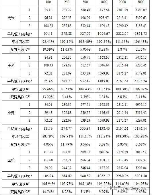 計算得出小麥的線性范圍:100~5000μg/kg(6點), 回歸方程: y = 0.981x + 60.52,相關(guān)系數(shù)R² = 0.997;玉米的線性范圍:100~5000μg/kg(6點), 回歸方程: y = 0.976x + 52.00,相關(guān)系數(shù)R² = 0.998;(見圖1和圖2)。
