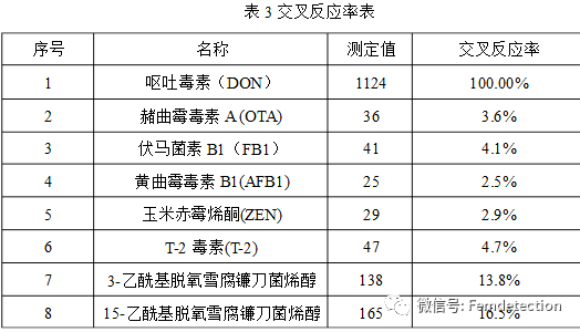 選擇 DON結(jié)構(gòu)類似物和其他5種真菌毒素的標準品在陰性玉米中進行添加,添加的濃度為1000 μg/kg,然后用飛測生物嘔吐毒素熒光定量檢測試紙條進行測試,每個樣品測3次取平均值;結(jié)果顯示與赭曲霉毒素A,伏馬菌素B1,黃曲霉毒素B1、T-2毒素、玉米赤霉烯酮交叉反應率均<5%,與其代謝物、結(jié)構(gòu)類似物有一定的交叉反應(<20%)。