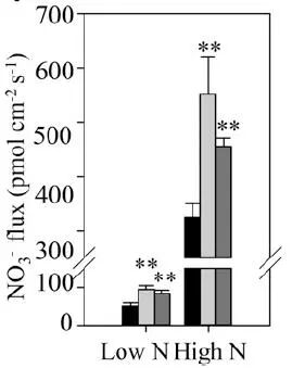 野生型與過表達(dá)型玉米,在高低氮條件下根部NO3-流檢測。正值表示吸收。