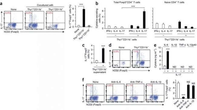 上述實(shí)驗(yàn)結(jié)果中可以發(fā)現(xiàn)ex Foxp3 TH17細(xì)胞在炎癥關(guān)節(jié)中聚集,作者假設(shè)關(guān)節(jié)中存在細(xì)胞與Foxp3+T細(xì)胞反應(yīng),促使其轉(zhuǎn)變?yōu)門(mén)H17細(xì)胞。設(shè)計(jì)實(shí)驗(yàn)從關(guān)節(jié)炎小鼠中分離Thy1+CD11b-細(xì)胞(滑膜成纖維細(xì)胞)和Thy1-CD11b+細(xì)胞(滑膜巨噬細(xì)胞)與Foxp3+CD4+T細(xì)胞(從未處理的Foxp3hCD2小鼠中分離)共同培養(yǎng),Thy1+CD11b-細(xì)胞下調(diào)了Foxp3+CD4+T細(xì)胞中Foxp3表達(dá)(圖3a)。將Thy1+CD11b-細(xì)胞與Foxp3+CD4+T細(xì)胞或naïve CD4+ T細(xì)胞共同培養(yǎng),檢測(cè)IL17+ Foxp3-細(xì)胞比例變化及細(xì)胞因子的表達(dá)(IFN-γ、IL-4),結(jié)果顯示滑膜成纖維細(xì)胞使exFoxp3 T細(xì)胞上調(diào)了IL-17的表達(dá)水平,IFN-γ和IL-4表達(dá)沒(méi)有變化,表明滑膜成纖維細(xì)胞在關(guān)節(jié)中促使Foxp3+T細(xì)胞轉(zhuǎn)變?yōu)門(mén)H17細(xì)胞。Naïve CD4+ T細(xì)胞沒(méi)有促使發(fā)生這一轉(zhuǎn)變。進(jìn)一步研究這一轉(zhuǎn)變發(fā)生的機(jī)制,將Thy1+CD11b-細(xì)胞和與Foxp3+CD4+T細(xì)胞共同培養(yǎng)的上清液與細(xì)胞分離分別檢測(cè)(圖3d),發(fā)現(xiàn)細(xì)胞并不能引起這個(gè)轉(zhuǎn)變;檢測(cè)和分析上清液的細(xì)胞因子表達(dá),結(jié)果顯示Thy+CD11b-細(xì)胞上清產(chǎn)生較高的IL-6因子,并在IL-17存在的情況下,IL-6表達(dá)進(jìn)一步加強(qiáng)(圖e)。加入抗IL-6抗體抑制了exFoxp3+ TH17細(xì)胞的產(chǎn)生。證明來(lái)源于滑膜成纖維細(xì)胞的IL-6是促使Foxp3+CD4+T細(xì)胞轉(zhuǎn)變?yōu)門(mén)H17細(xì)胞的關(guān)鍵因素。