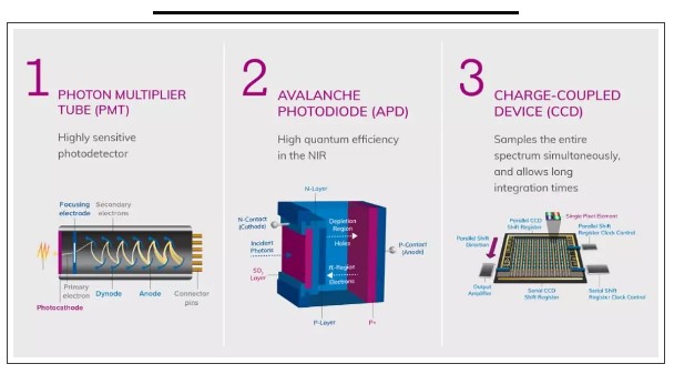 PMT和APD都屬于點探測器,只能探測光子信息,可通過掃描方式檢測光譜;CCD屬于線陣或者面探測器,可以成像。