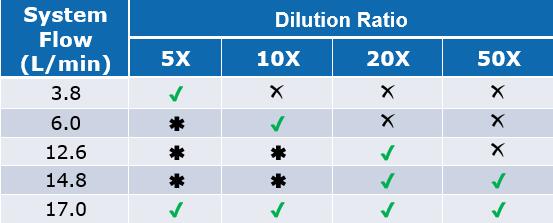 ✔ ), 系統(tǒng)可以做到的稀釋倍數(shù)和流速,但該實(shí)驗(yàn)未評(píng)估(*),不推薦(
