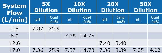 在使用1M磷酸鈉濃縮液對(duì)緩沖液稀釋系統(tǒng)進(jìn)行測(cè)試中,表明了在不同流速和在特定稀釋比例內(nèi),其pH和電導(dǎo)率表現(xiàn)出一致性。