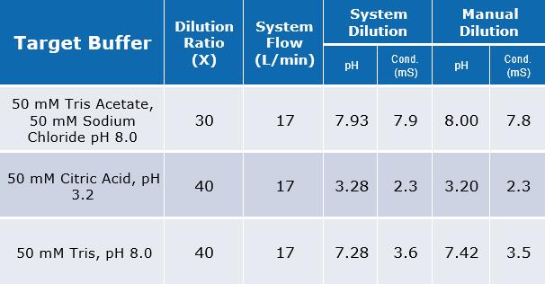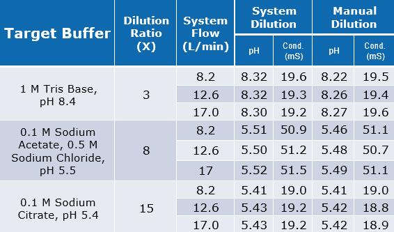 在表4列出的條件下,通過系統(tǒng)稀釋1M磷酸鈉溶液來同手動(dòng)操作配制的溶液進(jìn)行比較,以證明緩沖液稀釋系統(tǒng)的準(zhǔn)確度。當(dāng)比較給定稀釋比例內(nèi)的最小和最大流速的結(jié)果時(shí),pH和電導(dǎo)率是一致的,偏差小于0.1pH單位或0.5mS電導(dǎo)率。