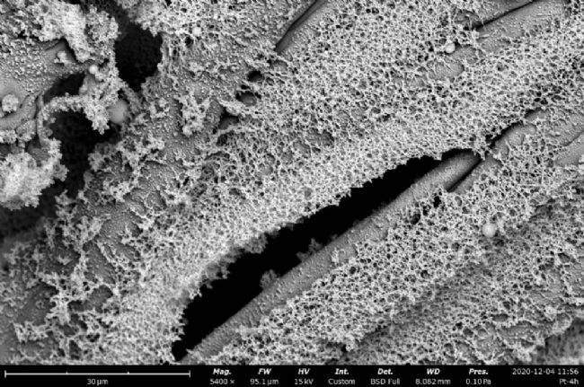 當氣流流速較快時,一部分質(zhì)量較大的顆;驁F聚體具備較大的動量。在于纖維接觸后,因為慣性的原因,大顆粒會來不及改變運動方向,從而被纖維攔截。而當沉積的時間足夠久,通過沖壓沉積形成的顆粒會結合成類似于蜘蛛網(wǎng)的結構,并且將孤立的纖維連接在一起。這種蜘蛛網(wǎng)結構保留了較多的氣孔,從而有利于氣體的擴散并暴露纖維本身的活性位點。