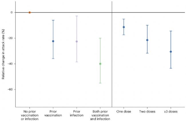 通過(guò)對(duì)上述索引病例進(jìn)行分析,作者發(fā)現(xiàn)在與索引病例平均接觸2.3天后,索引病例向所有密接者的未校正傳播風(fēng)險(xiǎn)為30% (95%可信區(qū)間: 27~32%)。其中,未接種疫苗的索引病例的傳播風(fēng)險(xiǎn)為36%(31~42%),而接種過(guò)疫苗的索引病例的傳播風(fēng)險(xiǎn)為28%(25~31%)。有既往SARS-CoV-2感染史(即再次感染)的索引病例向密接者的傳播風(fēng)險(xiǎn)(23%, 19~27%)低于無(wú)既往感染史的索引病例(33%, 30~37%)。在校正后,作者發(fā)現(xiàn)接種疫苗(≥1劑)的索引病例傳播風(fēng)險(xiǎn)比未接種疫苗索引病例的傳播風(fēng)險(xiǎn)降低22%(6~36%),并且每增加1劑疫苗,其傳播風(fēng)險(xiǎn)平均降低11%(5~17%);同樣,有既往感染史的索引病例的傳播風(fēng)險(xiǎn)降低了23%(3~39%),而有既往感染史又接種過(guò)疫苗的索引病例的傳播風(fēng)險(xiǎn)則降低了40%(20~55%)。此外,作者還評(píng)估了索引病例最近接種疫苗或自然感染的時(shí)間與感染后的傳染性之間的關(guān)聯(lián),結(jié)果表明最近接種疫苗的時(shí)間每增加5周,在SARS-CoV-2突破性感染后,病例的傳播風(fēng)險(xiǎn)增加6%(2~11%);但是并未觀察到距離最近感染的時(shí)間與傳播風(fēng)險(xiǎn)之間的聯(lián)系。最后作者評(píng)估了不同索引病例向密接者二次傳播的風(fēng)險(xiǎn),其中,初次感染(占索引病例的15%)、突破性感染(占索引病例的49%)和再次感染(占索引病例的7%)病例分別貢獻(xiàn)了20%(16~25%)、52%(47~57%)和7%(5~10%)的二次傳播,既往感染過(guò)又接種過(guò)疫苗的感染病例(占索引病例的29%)貢獻(xiàn)了21%(17~26%)的二次傳播。