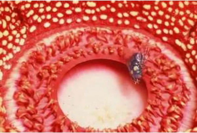 圖2 一只雌性紫綠蠅即將進(jìn)入寄生花雌花內(nèi)部。請(qǐng)注意蒼蠅背部有兩塊黃色花粉“糊狀物”(來自另一朵雄花)。與花盤下方接觸時(shí),這層外皮將被柱頭液重新液化并被刷下來。