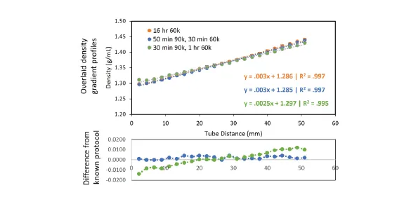 基于 Optima XPN超速離心機(jī)對于分段離心步驟設(shè)置的支持(在一次運(yùn)行中運(yùn)行多個轉(zhuǎn)速步驟),研究團(tuán)隊最終找到了一種能夠在80分鐘(50+30分鐘)內(nèi)達(dá)到密度梯度平衡的優(yōu)化方案,較之前16小時的舊步驟提升了近12倍效率。