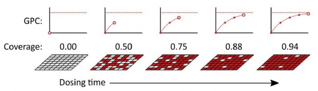 圖1:表面覆蓋率θ:在一個 ALD 半周期內(nèi),表面覆蓋率和 GPC 與給藥時間的關系。