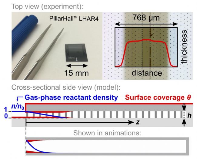 圖 4:在實驗中使用的由 VTT 提供的 PillarHall ™水平溝槽結構圖片(頂部),其中硅膜被移除,沉積的薄膜可見。結構的示意橫截面(中間)顯示了氣相反應物密度(藍線)和表面覆蓋率(紅色輪廓)。