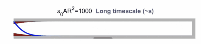 第一個動畫,其中 S0AR2=0.01,對應于反應限制生長。為了完整地表示生長過程,此動畫分為“短時間尺度”部分和“長時間尺度”部分。在現(xiàn)實生活中,這些階段分別大約需要微秒和秒,具體取決于實驗條件。在短時間尺度部分,我們可以看到藍線移動到溝槽中,直到它在各處具有相同的值。這對應于氣相反應物分子擴散到溝槽中,直到它們均勻分布。在長時間尺度部分,我們可以看到這導致表面覆蓋率均勻增加,如紅色輪廓所示。