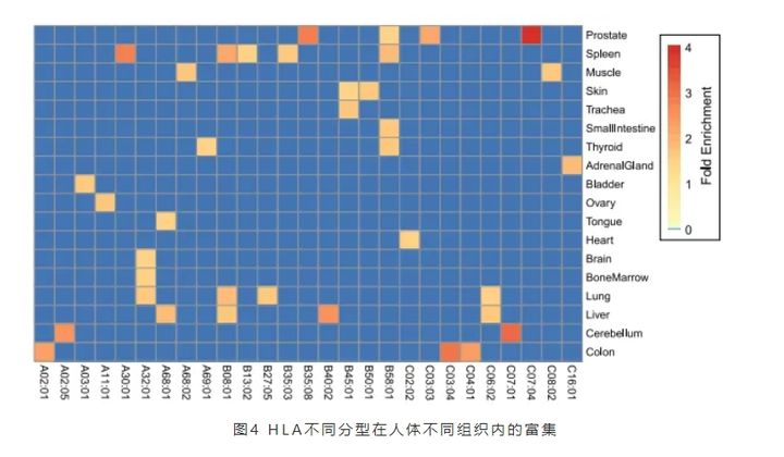 個(gè)體的數(shù)據(jù)進(jìn)行分析,發(fā)現(xiàn)人類MHC-I多肽的3種分型(HLA- A/B/C)在不同組織內(nèi)的分布存在極大的差異(圖3A),進(jìn)一步細(xì)化到各亞型的不同分型更加證實(shí)了這種差異。例如, 個(gè)體AUT-DN12的結(jié)腸中,HLA-A*02:01的比例明顯高于其他個(gè)體(圖3 B-D)。 為了進(jìn)一步研究這種“組織特異性”的差異在人類群體水平上是否同樣存在,作者進(jìn)一步計(jì)算了群體水平上不同分型的平均富集值。通過熱點(diǎn)圖(圖4)可以發(fā)現(xiàn),在群體水平上,某些分型在特定組織內(nèi)的表達(dá)明顯升高(圖4)