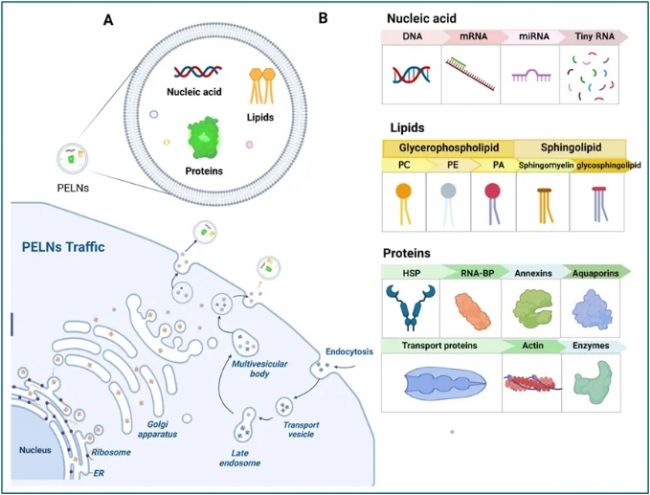 根據(jù)目前的研究,植物外泌體的生物發(fā)生有三種可能的途徑(圖3):外囊陽性細胞器(EXPO)途徑、多泡體(MVBs)途徑和液泡途徑。其中,MVBs途徑被認為是PELNs形成的主要途徑;具^程包括質(zhì)膜向內(nèi)出芽以形成早期內(nèi)體,這些內(nèi)體成熟并與反式高爾基體網(wǎng)絡通信,形成MVBs。MVBs內(nèi)的腔內(nèi)囊泡(ILV)可以包含各種物質(zhì),如RNA、DNA、脂質(zhì)等。MVBs與質(zhì)膜融合后,ILV可釋放到細胞外間隙,形成PELNs。該途徑與已知的哺乳動物來源外泌體(MDEs)的生物發(fā)生途徑高度相似。EXPO途徑涉及形成類似于自噬體的雙膜結(jié)構(gòu),它可以與質(zhì)膜融合,向細胞壁釋放單膜囊泡。液泡途徑主要發(fā)生在植物防御真菌病原體期間。感染后,液泡與質(zhì)膜融合并釋放其水解酶和防御蛋白的內(nèi)容以抵消病原體的入侵。它們在植物的生長、發(fā)育和應對外界環(huán)境變化的過程中逐漸形成和釋放。植物細胞的細胞壁結(jié)構(gòu)和復雜的胞內(nèi)環(huán)境賦予了植物外泌體獨特的生成條件。