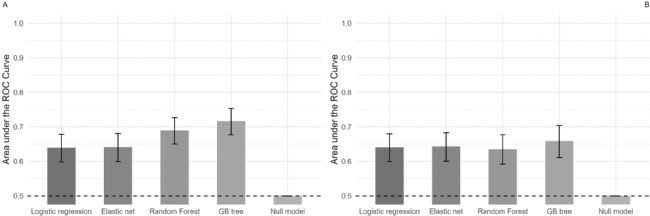 研究團(tuán)隊(duì)一開始測(cè)了很多指標(biāo)(即全生物標(biāo)志物,圖 1B),但最后發(fā)現(xiàn):只選 8 個(gè)關(guān)鍵指標(biāo)(比如 DHEA-S、TSH、CRP 這些)組合起來分析(圖 1A),反而最能分清 “試過自殺” 和 “沒試過自殺” 的孩子。全生物標(biāo)志物組(圖 1B):AUC 僅 0.635-0.659(整體 “較差”),復(fù)雜模型(梯度提升樹)僅 0.659,說明納入過多無(wú)關(guān)指標(biāo)(如 rfNIRS 血氧、rHRV)反而干擾判斷。精簡(jiǎn)生物標(biāo)志物組(圖 1A)AUC 提升至 0.639-0.717(“較差 - 尚可”),其中梯度提升樹達(dá) 0.717,是所有模型中最高。
