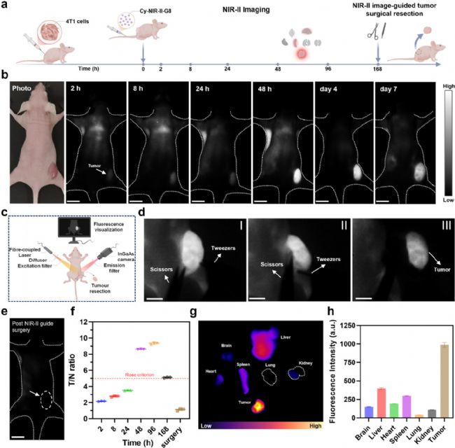 圖6. 樹狀Cy-NIR II- G8的體內腫瘤聚集和NIR-II圖像引導手術
