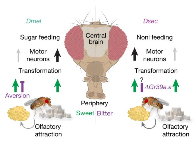 特化物種Drosophila sechellia(Dsec)專(zhuān)食諾麗果,而另兩種廣食性果蠅食譜多樣。通過(guò)定量攝食實(shí)驗(yàn)與鈣成像技術(shù),研究發(fā)現(xiàn):1)Dsec對(duì)諾麗果的偏好與其外周味覺(jué)神經(jīng)元苦味敏感性增強(qiáng)相關(guān),該變化源于單個(gè)味覺(jué)受體基因的小片段缺失;2)關(guān)鍵差異并非僅來(lái)自外周受體,更取決于感覺(jué)運(yùn)動(dòng)回路中對(duì)諾麗果與蔗糖信號(hào)的特異性中樞處理方式。