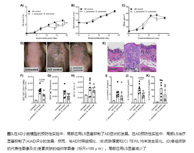 副干酪乳桿菌、膜畢赤酵母和釀酒酵母的混合微生物培養(yǎng)物(LS)具備免疫調(diào)節(jié)和抗炎作用。在體外培養(yǎng)中,LS能促進(jìn)小鼠樹突狀細(xì)胞系DC2.4分泌IL-10和TNFα,并劑量依賴性地抑制經(jīng)TNFα/IFNγ刺激的人表皮角質(zhì)形成細(xì)胞系HaCaT產(chǎn)生IL-8和TARC。在AD小鼠模型中,治療性給藥未改善小鼠的臨床癥狀、皮膚厚度和經(jīng)表皮失水量,但改善了皮膚角化層增生、表皮痂皮等組織病理學(xué)特征,同時(shí)降低了局部淋巴結(jié)中IgE陽性B細(xì)胞數(shù)量和IL-4水平;而預(yù)防性給藥效果更明顯,降低了AD臨床評分,改善了皮膚組織病理學(xué)特征,并減少了局部淋巴結(jié)中的效應(yīng)T細(xì)胞數(shù)量和IL-13水平。整體而言,LS通過免疫調(diào)節(jié)和抗炎作用,能夠有效預(yù)防特應(yīng)性皮炎的發(fā)生發(fā)展。