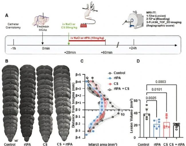 作為新型類纖溶藥物在缺血性中風(fēng)中的治療潛力,核心發(fā)現(xiàn):在纖維蛋白豐富型血栓栓塞中風(fēng)模型(rtPA 敏感)中,CS 單獨(dú)使用可減少 36% 病灶體積、改善組織再灌注和功能連接恢復(fù),且不增加出血轉(zhuǎn)化風(fēng)險(xiǎn),效果接近 rtPA。研究結(jié)果支持 CS 作為 rtPA 禁忌患者的潛在替代或輔助治療方案,尤其適用于纖維蛋白豐富型中風(fēng)。