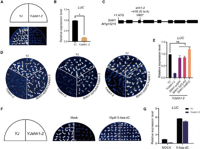研究團隊通過正向遺傳學篩選,在YJ報告株系背景下鑒定出一個新的突變體YJshh1-2,該突變體表現(xiàn)出LUC報告基因發(fā)光強度顯著減弱(圖1A)。RT-qPCR證實其LUC轉(zhuǎn)錄本水平顯著降低(圖1B)。通過遺傳互補實驗,將帶有原生啟動子的SHH1基因(融合eGFP、3×FLAG或3×MYC標簽)回補到Y(jié)Jshh1-2中,能夠完全恢復(fù)LUC的發(fā)光和表達(圖1D、E),證明表型確實由SHH1基因突變導(dǎo)致。此外,使用DNA甲基化抑制劑5-aza-2'-deoxycytidine (5-Aza-dC)處理YJshh1-2植株后,LUC表達得以恢復(fù)(圖1F、G),表明SHH1通過DNA甲基化通路調(diào)控LUC表達,提示其具有拮抗由DNA甲基化介導(dǎo)的轉(zhuǎn)錄沉默功能。