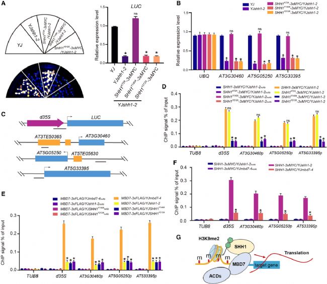 已知MBD7-ACD和SUVH1/3-DNAJ1/2是兩個能促進甲基化基因表達的DNA甲基化reader蛋白復(fù)合體。為確定SHH1屬于哪條通路,研究團隊構(gòu)建了YJshh1-2 mbd7-4、YJshh1-2 lil-1(LIL是MBD7-ACD復(fù)合體組分)和YJshh1-2 suvh1-1雙突變體。遺傳分析顯示,YJshh1-2 mbd7-4和YJshh1-2 lil-1雙突變體的LUC沉默表型相對于各自單突變體沒有疊加效應(yīng)(圖3A-D),而YJshh1-2 suvh1-1則表現(xiàn)出顯著的疊加效應(yīng)。表明SHH1很可能通過MBD7-ACD通路發(fā)揮作用。
