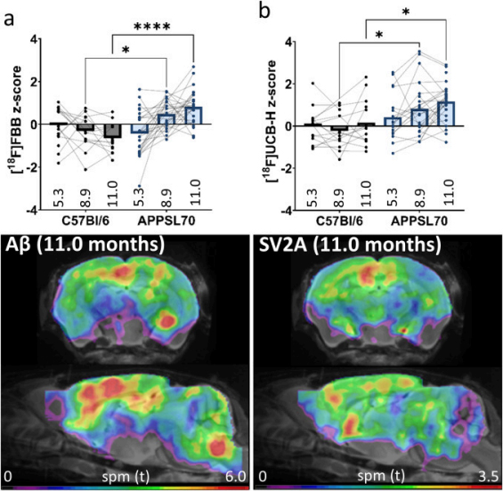 本研究遵循動物實(shí)驗(yàn)準(zhǔn)則,選取 28 只 APPSL70 小鼠和 17 只 C57Bl/6 野生型小鼠,于 5.3、8.9、11.0 月齡行