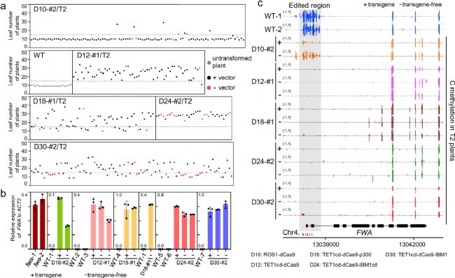 與甲基化工具類似,去甲基化工具誘導的修飾也能穩(wěn)定遺傳。在T2代植株(無論是否含轉基因)中,仍能觀察到晚花表型(圖5a)、FWA表達激活(圖5b)以及FWA啟動子的低甲基化狀態(tài)(圖5c)。例如,D10工具在T1代僅部分去甲基化,但在部分T2代中實現了完全去甲基化,表明ROS1可能需要多代傳遞才能達到完全效果。WGBS跨代數據確立了去甲基化修飾的穩(wěn)定遺傳功能。
