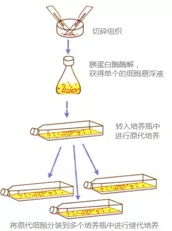 原代培養(yǎng):從動(dòng)物機(jī)體取出組織后切碎,經(jīng)過(guò)各種酶(常用胰蛋白酶),螯合劑(常用EDTA)結(jié)合機(jī)械方法(吸液管反復(fù)吸吹)處理,分散成單細(xì)胞,置于合適的培養(yǎng)基中培養(yǎng),使細(xì)胞得以生存、生長(zhǎng)和繁殖。一般把從動(dòng)物有機(jī)體內(nèi)取出細(xì)胞開始培養(yǎng),到繁殖十代以內(nèi)的細(xì)胞培養(yǎng)稱為原代細(xì)胞培養(yǎng)。