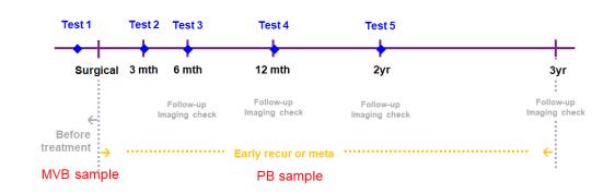 科學(xué)家設(shè)計(jì)的試驗(yàn)流程如圖 3 所示。 手術(shù)前第 1 次取樣,為腸系膜靜脈血(Mesenteric Venous Blood, MVB);手術(shù)后在第 3、 6、 12、 24 個(gè)月進(jìn)行第 2-5 次取樣,為外周血(Peripheral Blood, PB)。第 1 次取樣用于判斷患者的癌癥風(fēng)險(xiǎn)等級,對風(fēng)險(xiǎn)等級高的患者進(jìn)行組合療法(如增加化療);第 2-5 次取樣用于監(jiān)測早期復(fù)發(fā)和轉(zhuǎn)移的患者,對 CTCs 陽性的患者會(huì)建議更頻繁的監(jiān)測和積極治療。