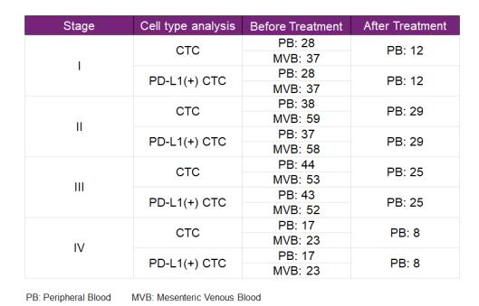 對于手術(shù)前取樣的腸系膜靜脈血(MVB)樣本, CTCs 和 PD-L1(+) CTCs 的數(shù)目和腫瘤階段密切相關(guān), PD-L1(+) CTCs 的數(shù)目可以預(yù)示腫瘤未來是否會(huì)入侵血管和淋巴管,是否是潛在高風(fēng)險(xiǎn)族群? 對 Stage Ⅱ的患者, MVBCTCs 的檢測可以幫助確認(rèn)在手術(shù)后是否要進(jìn)行化療? 手術(shù)后取樣的外周血(PB)樣本,可用來預(yù)測早期復(fù)發(fā)或轉(zhuǎn)移的患者,有利于對患者進(jìn)行長期跟進(jìn)。 對于本次臨床研究, MiCareo公司會(huì)繼續(xù)跟進(jìn)患者, 收集更多的樣本進(jìn)行后續(xù)研究【6】。
