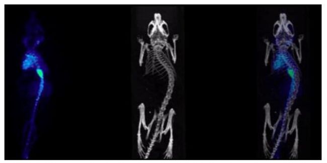 圖 8. 來(lái)自肺腫瘤模型研究的小鼠的 PET(左)和 PET/CT( 右) 圖像, 6.47MBq( 175μ Ci)