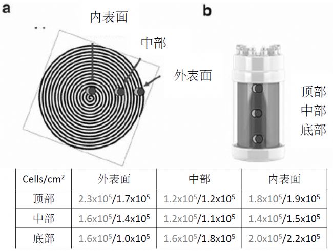 圖1. 拆解的Univercells scale-X hydro生物反應器的細胞技術。從頂部(a)和側面(b)觀察的scale-X 生物反應器示意圖。淡灰和深灰點指示用于細胞密度分析的取樣點。淡灰=內側膜的取樣,深灰=外側膜層的取樣。對于細胞密度分析,對固定床頂部、中部和底物、卷膜的外表面、中部以及內表面進行細胞核計數(shù)。示意圖下方表格中所示為細胞密度(cells/cm2)。