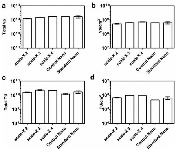 圖4. scale-X hydro生物反應器和iCELLis Nano生物反應器運行中的慢病毒載體產量。(a、b)scale-X生物反應器和iCELLis Nano生物反應器運行中,分別生產的總慢病毒顆粒(vp)和vp/cm2。(c、d)scale-X生物反應器和iCELLis Nano生物反應器運行中,分別生產的總TU和TU/cm2。對照Nano = Nano 運行,與scale-X生物反應器運行一同進行。標準Nano = 5個標準Nano運行的平均值。scale-X 1-4=scale-X生物反應器運行1-4。平均值±SEM。TU,轉導單位;VP,載體顆粒。