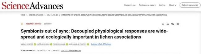 2024年6月14日,Science Advances雜志在線發(fā)表美國明尼蘇達(dá)大學(xué)Daniel E. Stanton實(shí)驗(yàn)室題為Symbionts out of sync: Decoupled physiological responses are widespread and ecologically important in lichen associations的研究論文。在本研究中,Abigail R. Meyer等人研究了地衣(Evernia mesomorpha)中這種不對(duì)稱的生理、生態(tài)和轉(zhuǎn)錄基礎(chǔ)。這種碳平衡的不對(duì)稱性取決于水合來源,并與氣候范圍的限制相一致。E. mesomorpha共生體的基因表達(dá)差異表明,主要地衣共生體的生理結(jié)構(gòu)是分離的。此外,研究人員還利用氣體交換數(shù)據(jù)表明,碳平衡的不對(duì)稱性在進(jìn)化過程中不同的地衣共生體中普遍存在。以碳平衡不對(duì)稱為例,他們?yōu)楣采w中生理不對(duì)稱的廣泛重要性提供了證據(jù)。