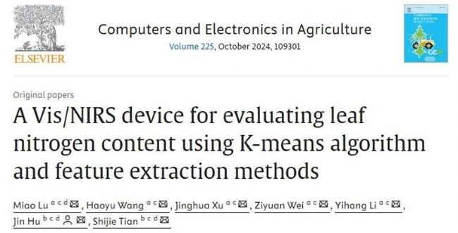 準(zhǔn)確評(píng)估葉氮含量(LNC)對(duì)實(shí)際生產(chǎn)和肥料管理至關(guān)重要。2024年8月7日,西北農(nóng)林科技大學(xué)信息工程學(xué)院胡瑾教授課題組在Computers and Electronics in Agriculture發(fā)表題為A Vis/NIRS device for evaluating leaf nitrogen content using K-means algorithm and feature extraction methods的研究論文。在這項(xiàng)研究中,盧苗等人設(shè)計(jì)了一種便攜式設(shè)備,用于快速、無損地精確評(píng)估葉氮含量。