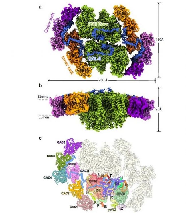 放氧光合作用是自然界中重要的生命過程,可以將光能轉(zhuǎn)化為化學(xué)能,合成有機(jī)物的同時(shí)釋放氧氣,為地球上絕大多數(shù)生命提供物質(zhì)和能量。位于類囊體膜上的光系統(tǒng)I(photosystem I, PSI)和光系統(tǒng)II (photosystem II, PSII)對(duì)于光合作用光反應(yīng)至關(guān)重要,兩個(gè)光系統(tǒng)均由核心和外周捕光天線構(gòu)成,其中光系統(tǒng)核心是高度保守的,但結(jié)合在核心外周的捕光天線在不同物種間存在著巨大差異,這些差異反映了不同光合生物對(duì)特定生存環(huán)境的適應(yīng),也體現(xiàn)了自然界中多樣的光合調(diào)節(jié)機(jī)制。隱藻是由紅藻經(jīng)次級(jí)內(nèi)共生過程演化出的一類單細(xì)胞真核微藻,具有極其獨(dú)特的捕光天線,包括位于類囊體膜內(nèi)的葉綠素 a/c 結(jié)合蛋白(chlorophyll a/c proteins,CAC)和結(jié)合在類囊體膜外腔側(cè)的藻膽蛋白(phycobiliprotein,PBP)。由于缺少隱藻光系統(tǒng)的結(jié)構(gòu)信息,其核心與捕光天線的組裝方式及其捕光調(diào)節(jié)機(jī)制尚不清楚,解析隱藻光系統(tǒng)-捕光天線復(fù)合物的高分辨率結(jié)構(gòu)不僅為揭示這類光合生物的光合調(diào)節(jié)機(jī)制提供結(jié)構(gòu)基礎(chǔ),而且能夠?yàn)樘岣咧参锏墓饽芾眯省⒃黾幼魑锂a(chǎn)量等提供新思路。